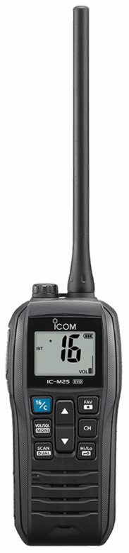 - Galleggiante: in caso di caduta accidentale in acqua, l’IC-M25EURO EVO galleggia, il display e la tastiera si illuminano ad intermittenza ed un led rosso ad alta luminosità inizia a lampeggiare. L’apparato galleggia anche con il microfono HM-213 (opzionale) collegato