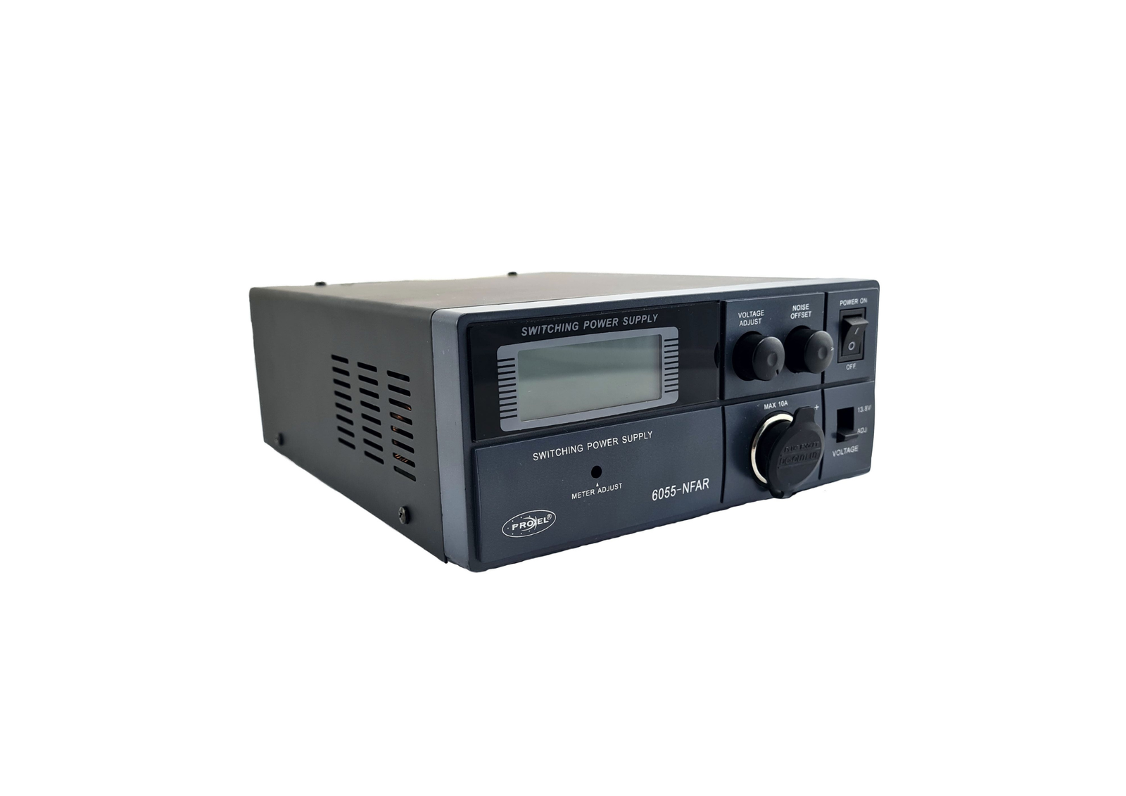 Il PROXEL 6055-NFAR Digital (NOISE FREQUENCY ADJUSTMENT ) è un alimentatore switching ad alta efficienza, compatto, leggero e con grandi performance. Studiato per ridurre al minimo il rumore di commutazione in particolare nelle radiocomunicazioni HF. Nelle trasmissioni in HF (2-30MHz) può capitare di sentire un rumore di fondo nella frequenza di trasmissione causata dal clock dello switching. Con la funzione NFA si può traslare tale rumore dalla frequenza di trasmissione. Altre funzioni utili sono il pre-settaggio del voltaggio, e la retroilluminazione degli strumenti . Nell’eventualità in cui l’alimentatore andasse in auto-protezione o in caso di corto-circuito, si interromperà l’erogazione di tensione: per resettarlo spegnere l’interruttore on-off e riaccenderlo dopo circa 2 minuti.